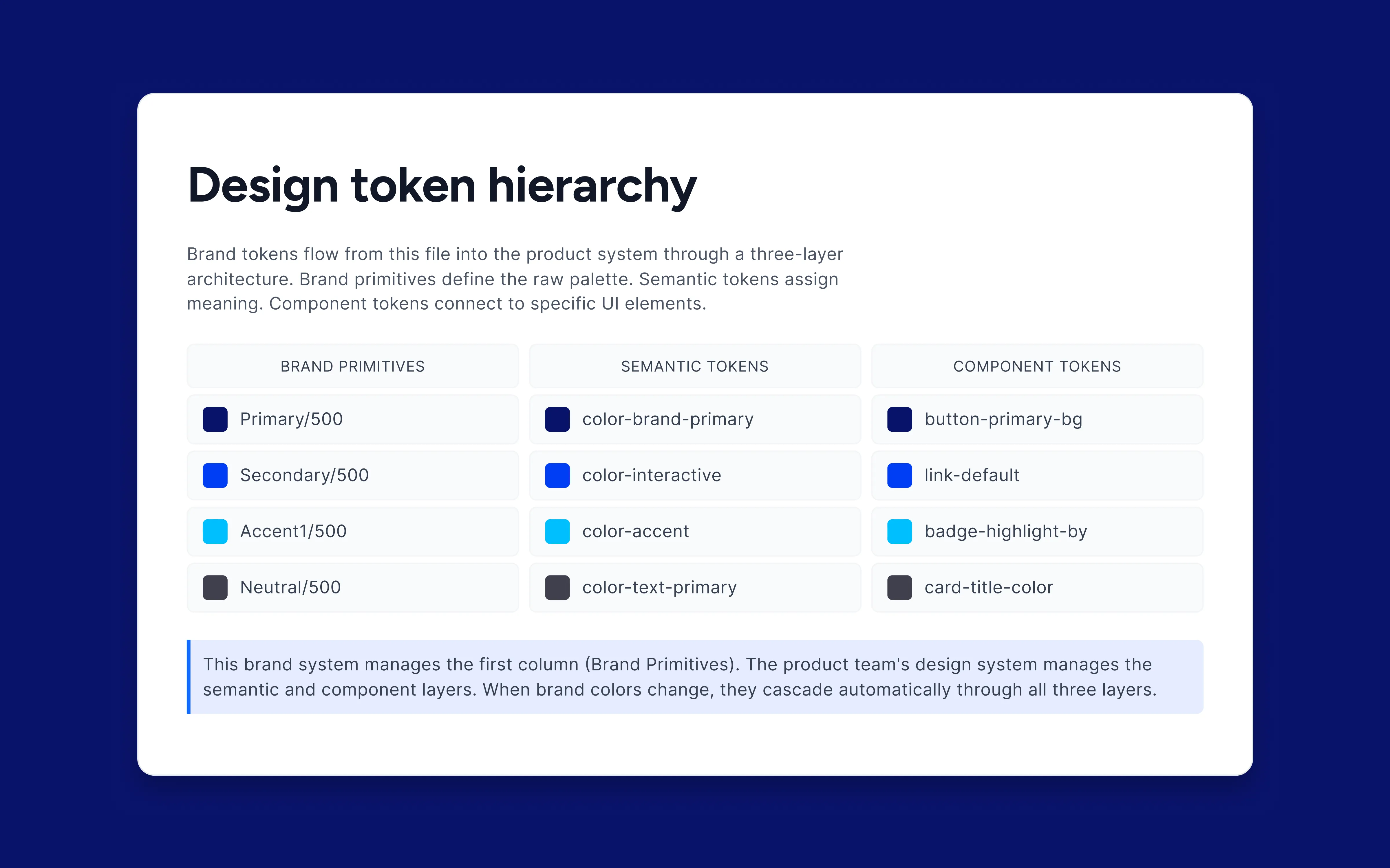 Three-layer token architecture. Brand primitives feed into semantic tokens, which feed into component tokens. Change one value, it flows everywhere.